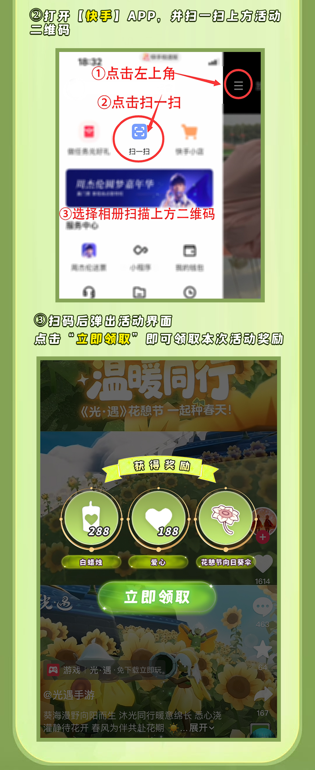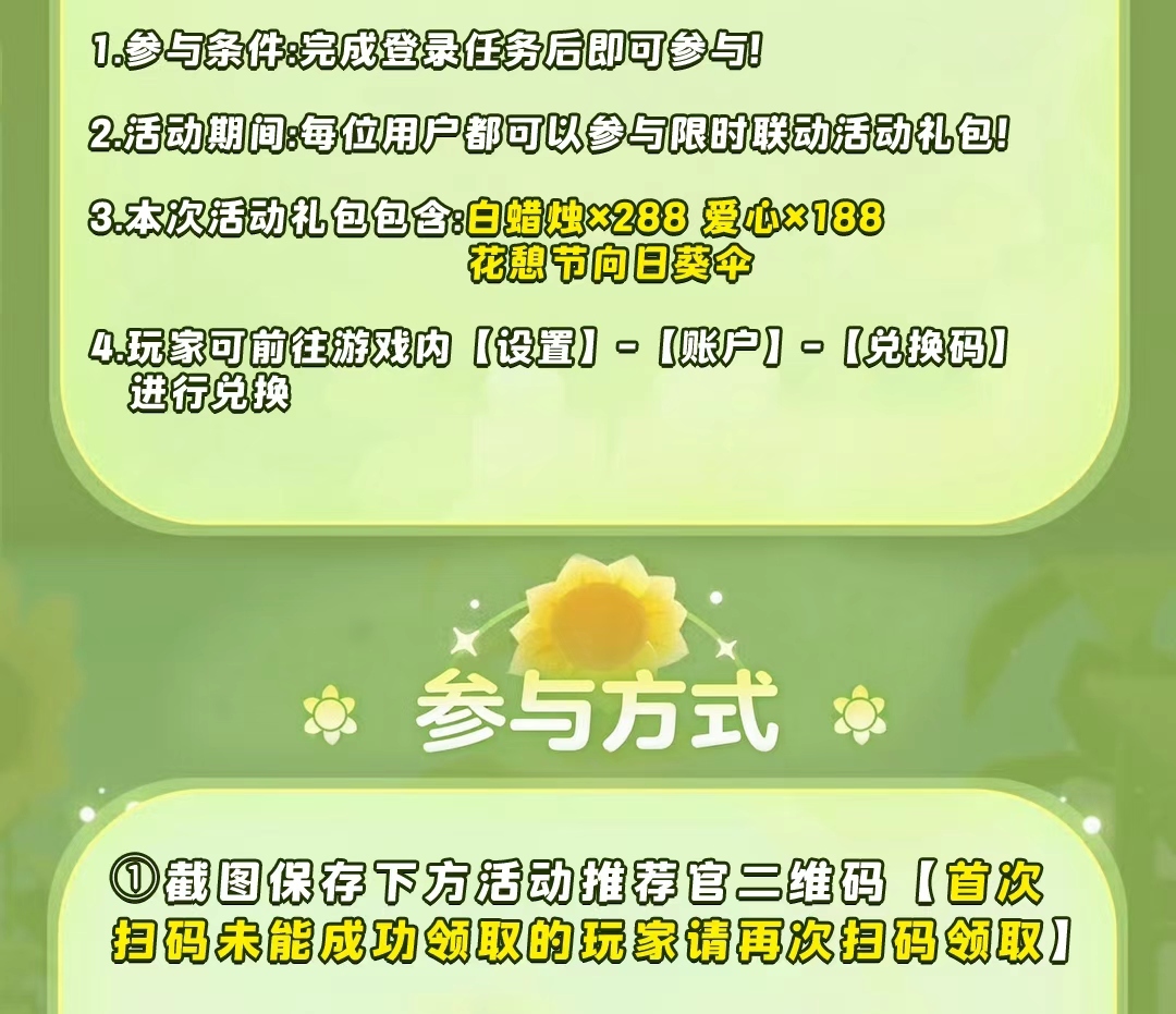 恭喜你!领取了白蜡烛*288、爱心*188和花憩节向日葵伞。兑换码:9JKX82JYNJQ。(兑换码仅限一次使用)